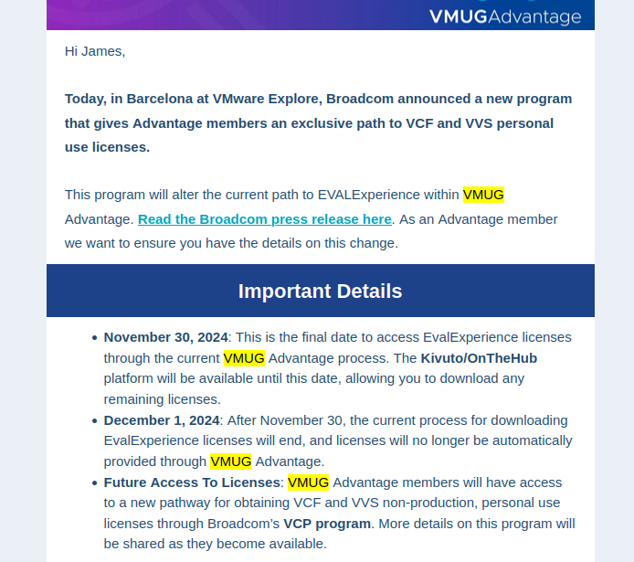 On Nov 5, VMUG members received notice that VMware was changing the way Eval licensing was provided. This change was abrupt, one which we were assured would not occur, and a continuation of the cannibalistic behavior of Broadcom in their quest to maximize profit over at VMware after the acquisition.