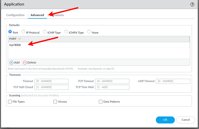Under "Defaults", select "Port" and add the entry tcp/8006. When done, meander over to the "Signatures" tab.