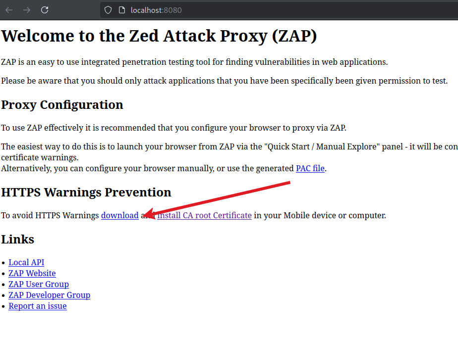 The first thing you'll want to do is go over to your browser and visit the local ZAP proxy to download the CA. This is optional, but prevents us from getting certificate warnings when we're working with Proxmox. That is assuming you've already installed a certificate from a trusted issuer on Proxmox.