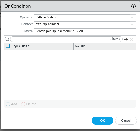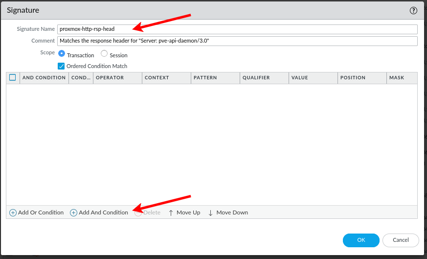 For our use case, we're going to leave these at "Transaction" for Scope and "Ordered Condition Match" set to enabled. Since we really only need to look for one value thanks to Proxmox persisting the correct server header across responses, we don't need anything too advanced at the moment.