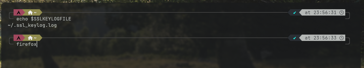 On Linux, set the SSLKEYLOGFILE in your shell profile (.bash_profile, .zshrc, etc). The pre-master secrets we need to decrypt the traffic will be logged to this file. Due to some oddities in my system, even though I'm using zsh as my main shell, I still need this set in my .bashrc file.