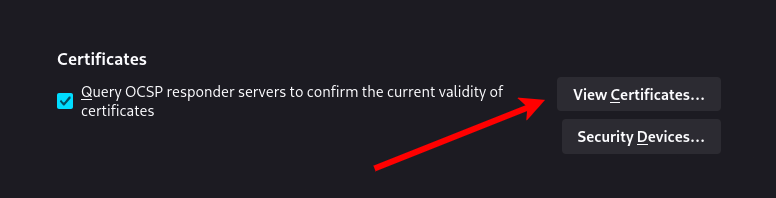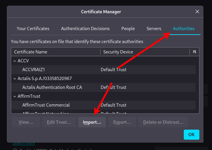 Next, we'll need to head over to our browsers trust chain manager and import this certificate.