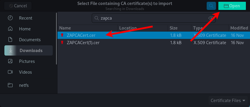You'll be met with a normal file dialog. Locate the certificate we downloaded earlier and click open.