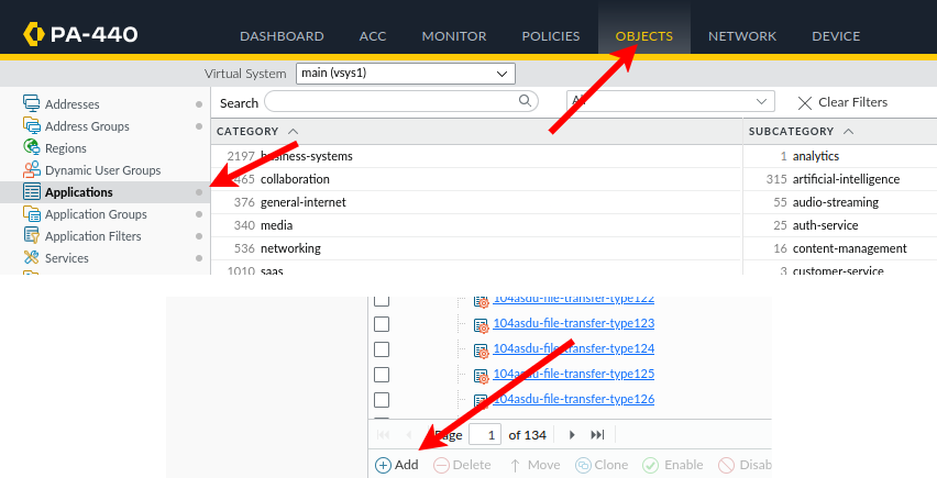 On our Palo, we'll head over to the "Objects" tab and go to "Application". Click "Add".