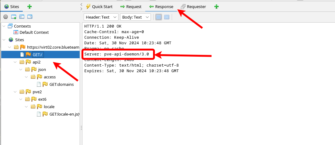 Reviewing the response headers from our GET:/ request, we can see something interesting already. The server header is reported as pve-api-daemon/3.0. This is good, we can already uniquely identify this without going too much further.