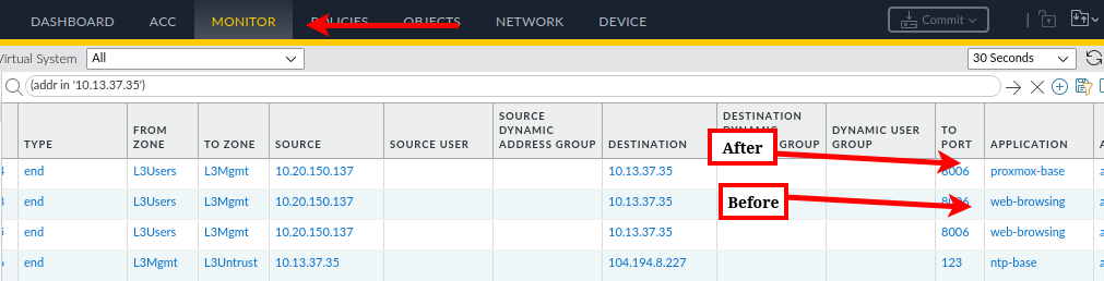 By searching for traffic to our PVE server, we can see that prior to this change, the app was being seen as "web-browsing", but now that the change has been committed, it's being seen as "proxmox-base". For once I did something right.