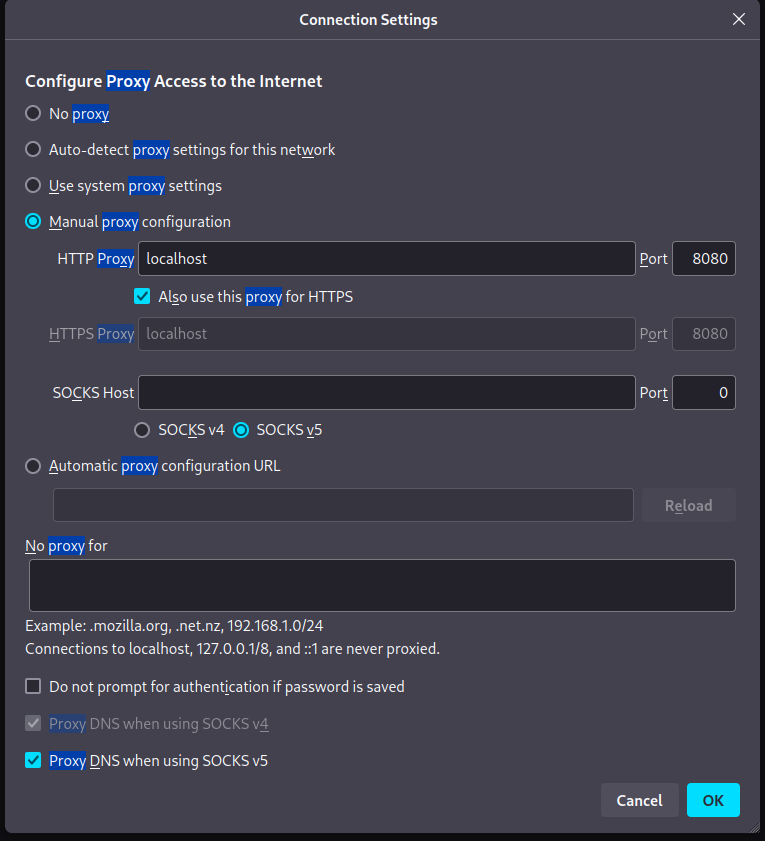 In the dialog, select "Manual Proxy Configuration" and enter "localhost" in the HTTP Proxy field, with the port "8080". Next, select "Also use this proxy for HTTPS". Click "OK" to close