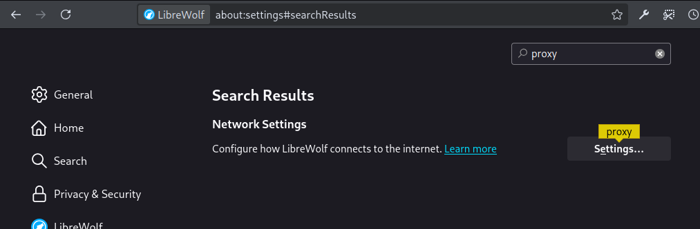 Navigate to about:setting in our web browser. Search for "Proxy" in the search bar. Open the "settings" button.