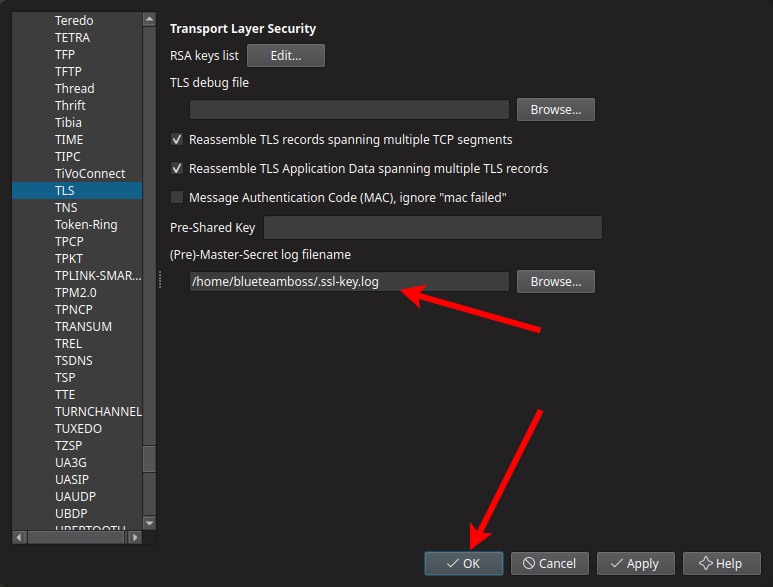 In the "(Pre)-Master-Secret log filename" field, enter the path to the log file we set earlier.