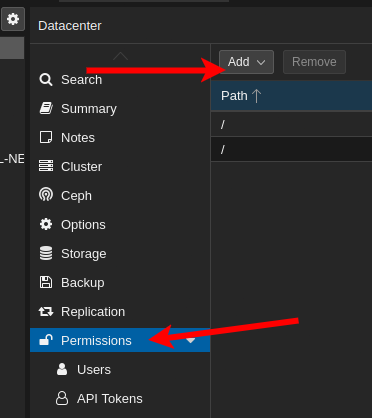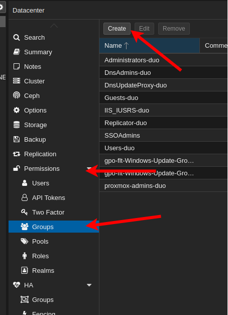Select the "Datacenter" and locate the "Permissions" section and expand it. Next, go to "Groups" and click Create.