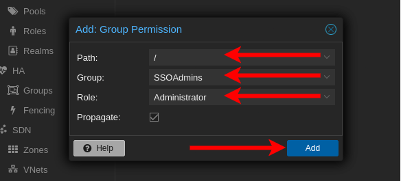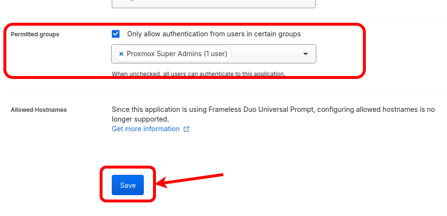 I would highly recommend restricting this to a specific group of users that can authenticate to this app. For myself, I'm using the group Proxmox Super Admins. Lastly, click "Save"