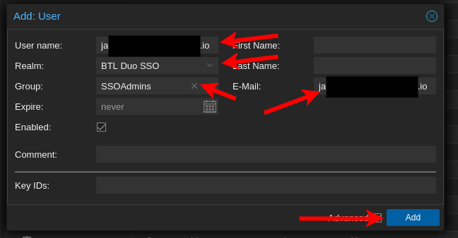 For the "Group", enter the group name we created earlier, SSOAdmins Lastly, enter the email again in the "E-Mail" field and click "Add"