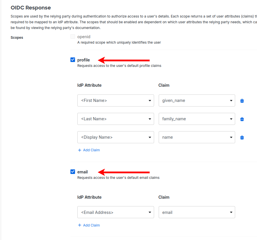 Scroll down to OIDC Response, and check the boxes for "profile" and "email" under "Scopes".