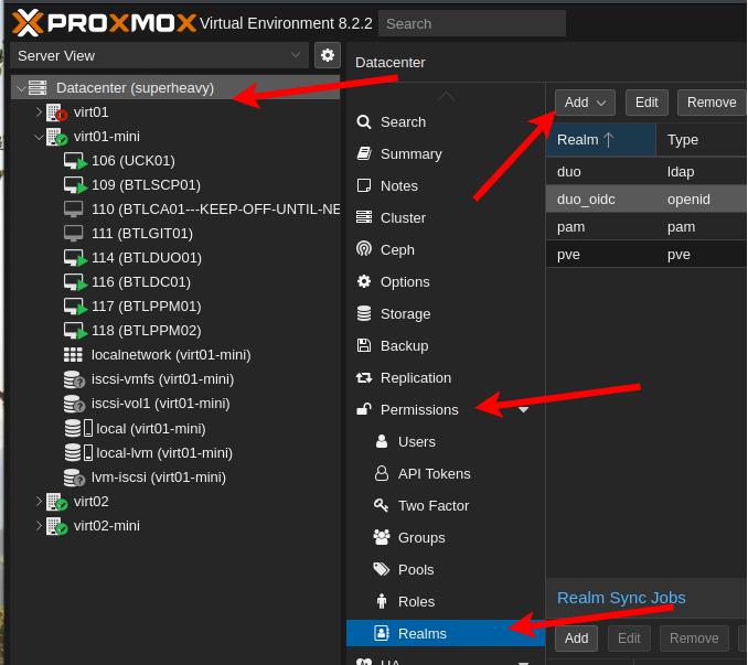Select the "Datacenter" and locate the "Permissions" section and expand it. Next, go to "Realms" and click Add. In the drop-down, select "Open ID Connect Server".
