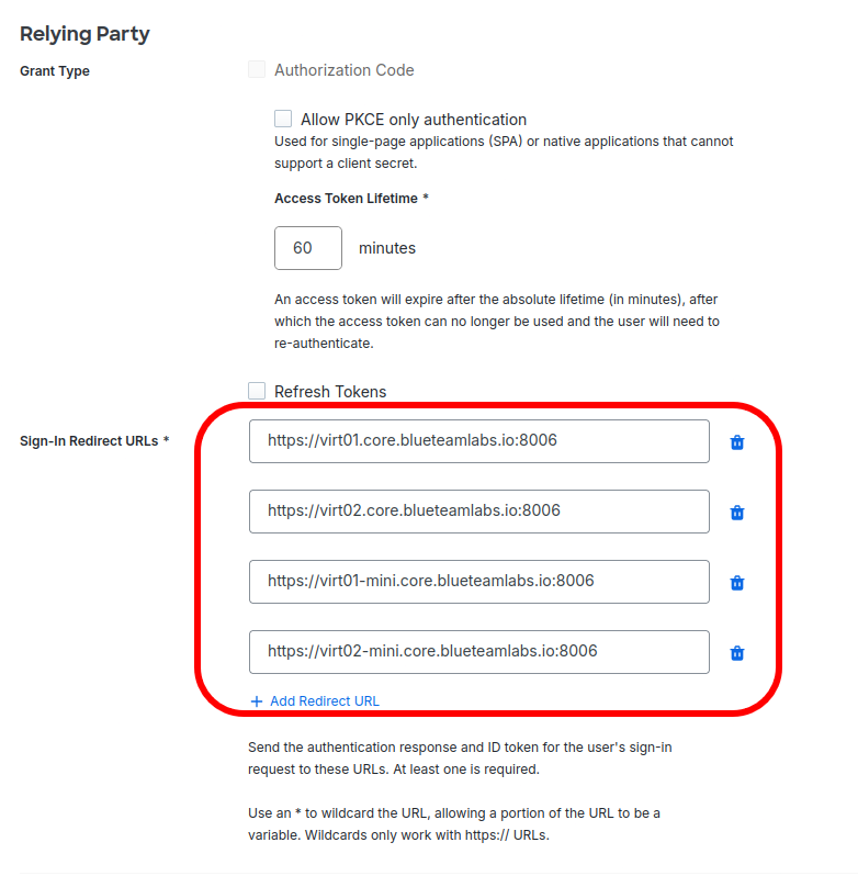 Scroll down until you find "Sign-In Redirect URLs". Here, add the URL for all of the Proxmox instances you want to be able to login with OIDC on.