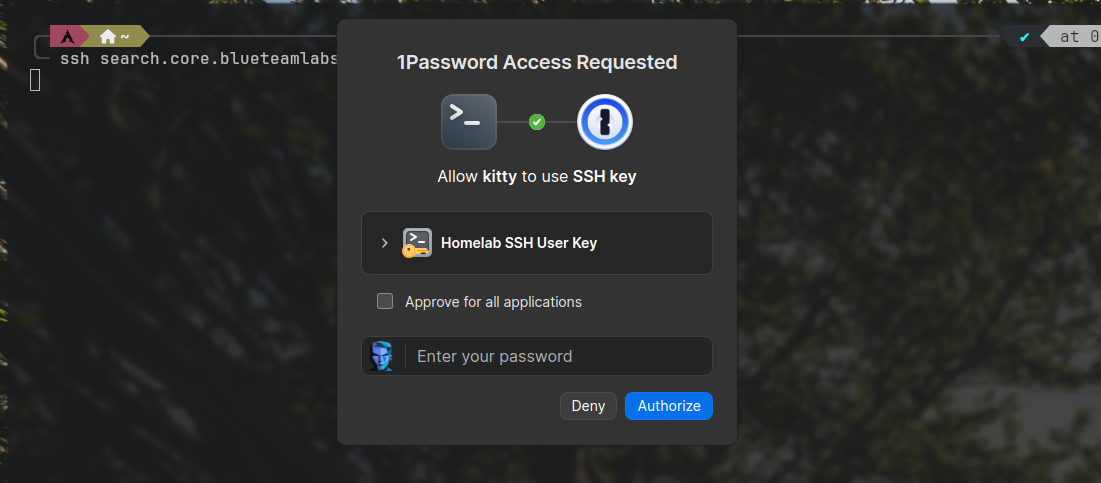 Next, go ahead and try to SSH into something. You should get the 1Password prompt. If not, you did something wrong or something is unique on your system that needs to be modified. If you're on Windows, sorry you'll have to find the instructions on your own. I do have it setup on Windows but don't feel like digging that up for y'all.