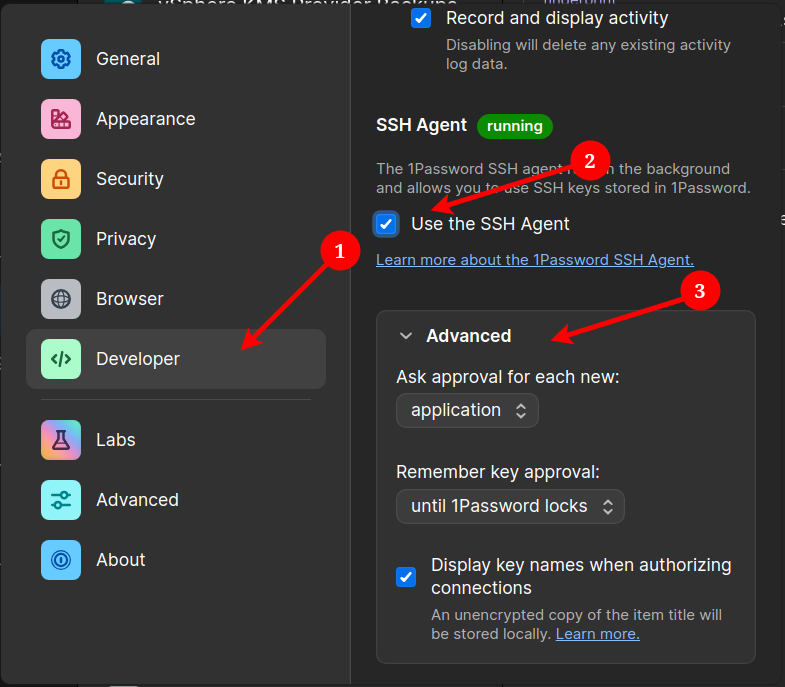 Next, go to "Developer", scroll to the "SSH Agent" section and check the box for "Use the SSH Agent". Optionally set any of the advanced settings to your liking.
