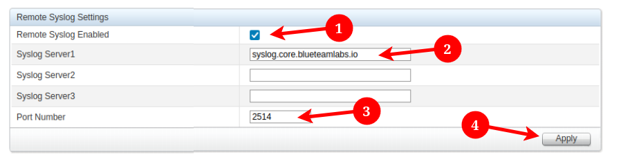 Next, we'll set our syslog server settings. First, check "Remote Syslog Enabled", then set the "Syslog Server1" to your syslog server, in my instance syslog.core.blueteamlabs.io.