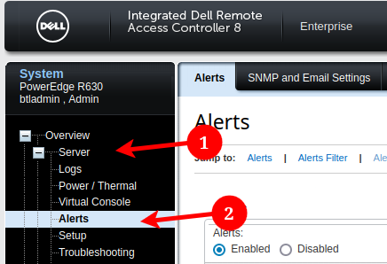 To configure this, we'll head over to the "Server" --> "Alerts" page. Here we'll be modifying the enabling Alerts and managing settings under the "Alerts and Remote System Log Confgiguration" settings