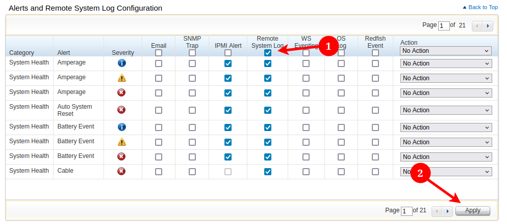 Under the "Alerts and Remote System Log Configuration", there are hundreds of event types and alerts we can configure. To simplify things, we'll just start by sending them all to our remote syslog server.