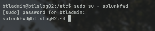 Once you see splunkfwd@<hostname> you're acting as the splunkfwd user and can continue on. You could do this as root or through sudo, but it might cause issues with permissions, so impersonating is the best bet.