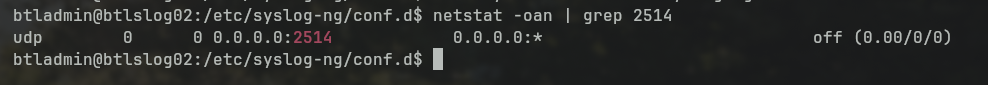 From the output of netstat, we can see that udp/2514 is bound and should be able to receive traffic now. I don't use the term "listening" as UDP is connectionless so "bound" or "open" is a more appropriate term.