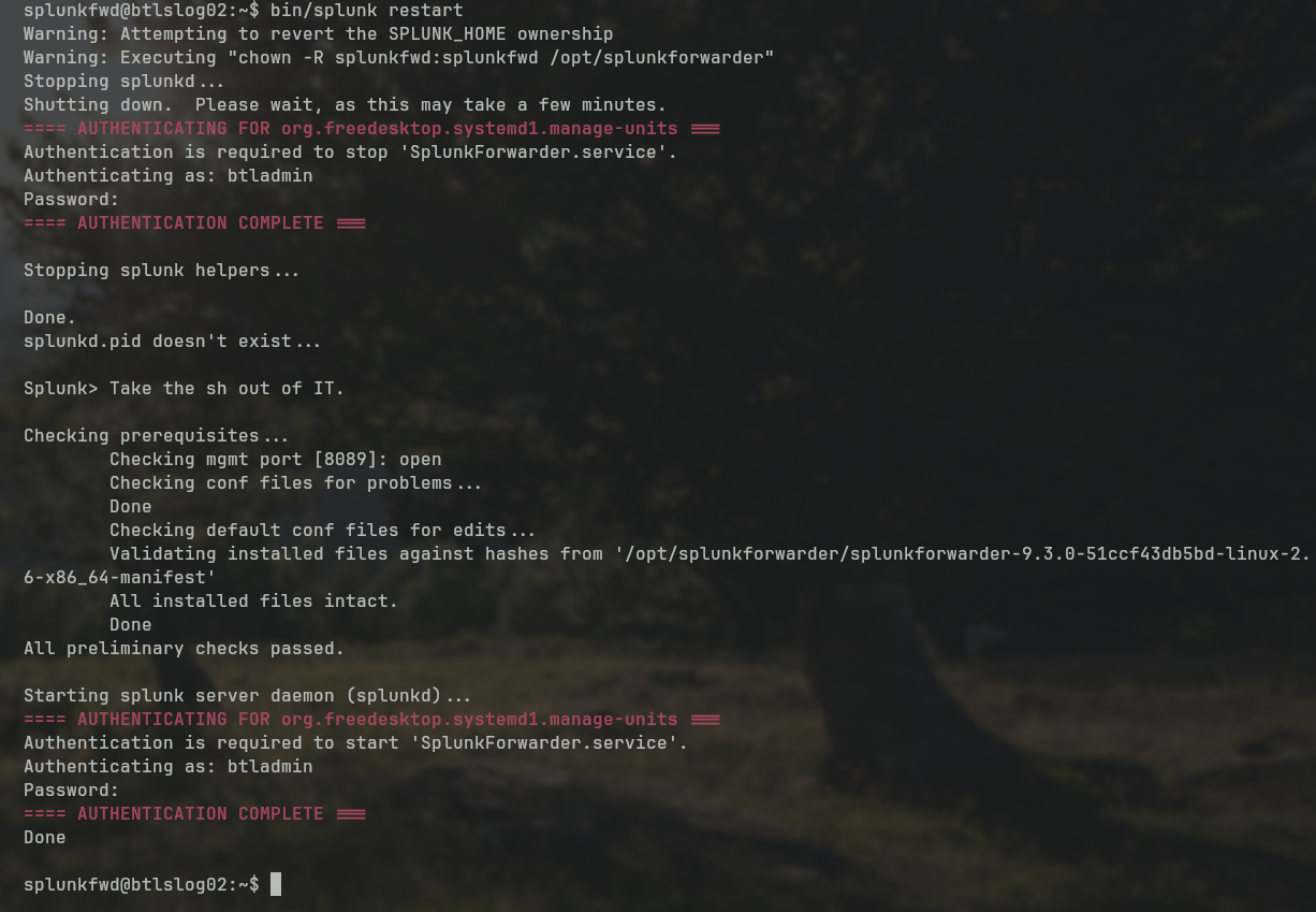 With that done, heave back on over too the Splunk forwarder. For this process I think it's best that we impersonate the splunkfwd user as this is what the Splunk forwarder service runs under.