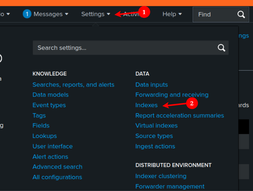 To create the index, log into Splunk and go to "Settings" --> "Indexes"