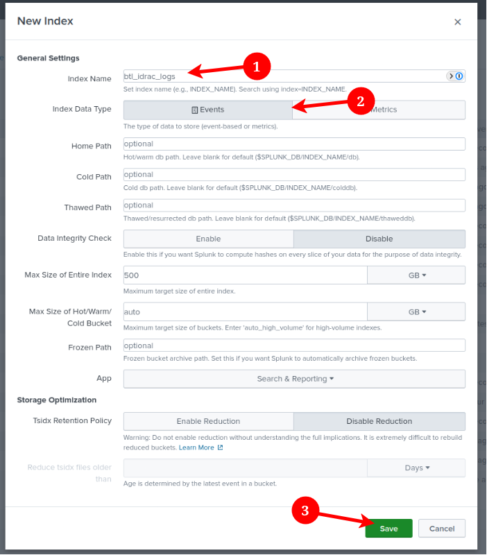 In the pop-up, enter your "Index Name", in my instance btl_idrac_logs. Ensure that the "Index Data Type" is set to "Events". You can optionally change any of the other settings to fit your needs, but the defaults are fine for me right now.