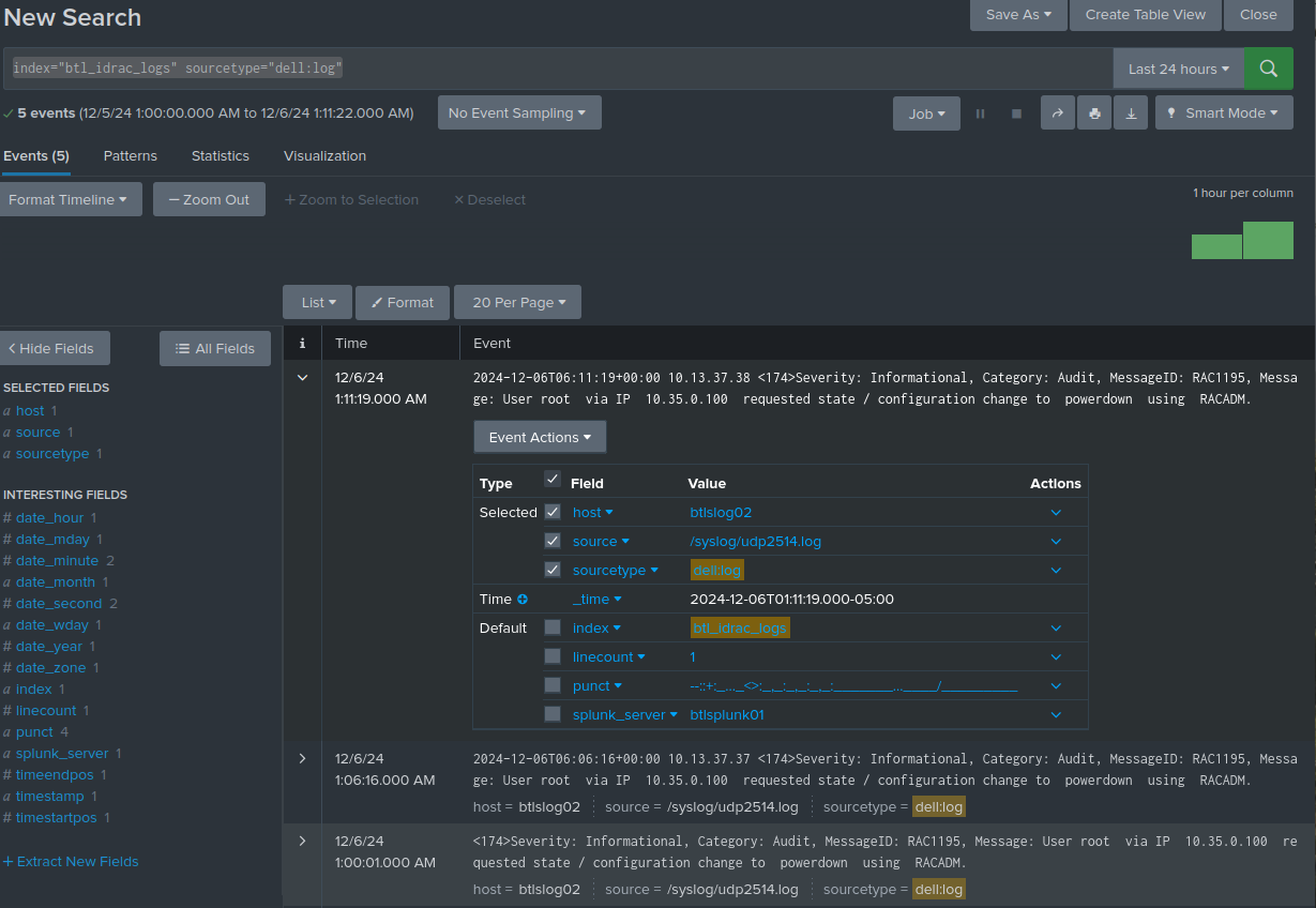 /syslog/udp2514.log file entries, via the [[monitor://]] section. We're then telling Splunk to index these in btl_idrac_logs via the index key. To aid in finding the logs, we're also telling it to set the sourcetype as dell:log via the sourcetype key.