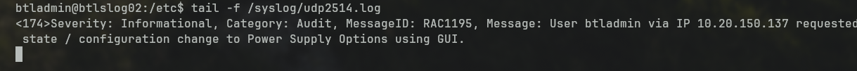 Next, we'll go back and generate some syslog alerts from iDRAC again by just modifying the power configuration to "Not redundant". I would recommend waiting too run the tail command until after you've generated the traffic, because it will be created on first write.
