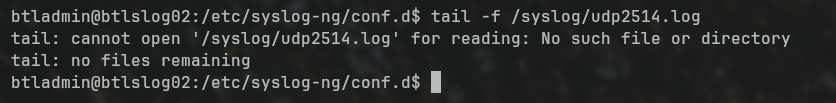 By running tail -f /syslog/udp2514.log we can see that theres something wrong. The file doesn't exist, which means that somethings wrong with the ingest for syslog-ng.