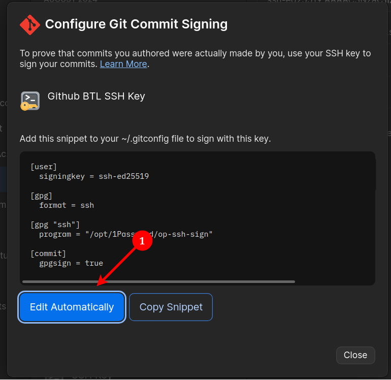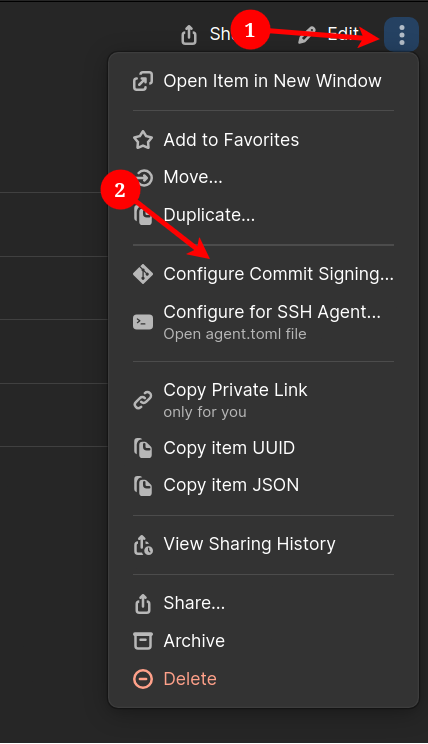 In 1Password, locate the key and hit the "Burger" icon, next click "Configure Commit Signing...".